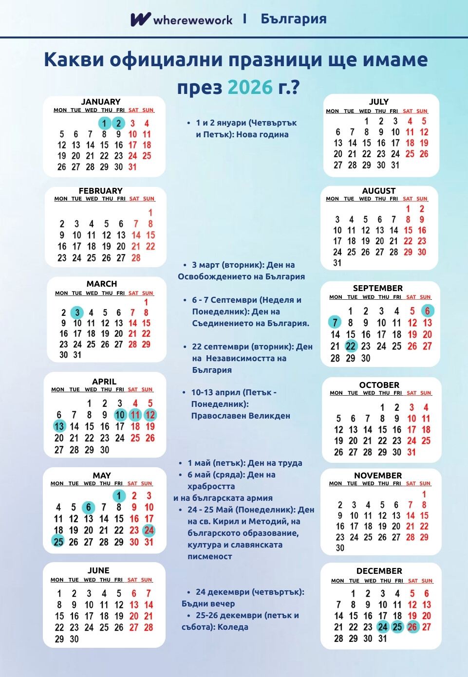 - Коледа: 24-28 декември (Четвъртък - Понеделник) = 5 дни с уикенда.