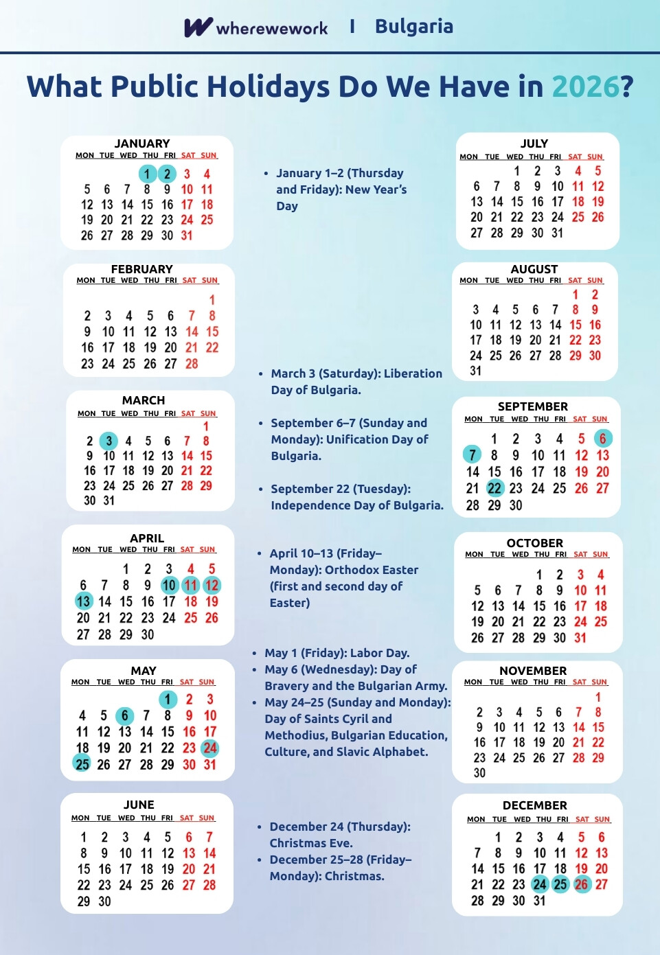 Here is the full list of official public holidays in Bulgaria for 2026, according to the official calendar. These include both fixed dates (national and religious holidays) and movable ones, such as Orthodox Easter, calculated according to the Eastern tradition.